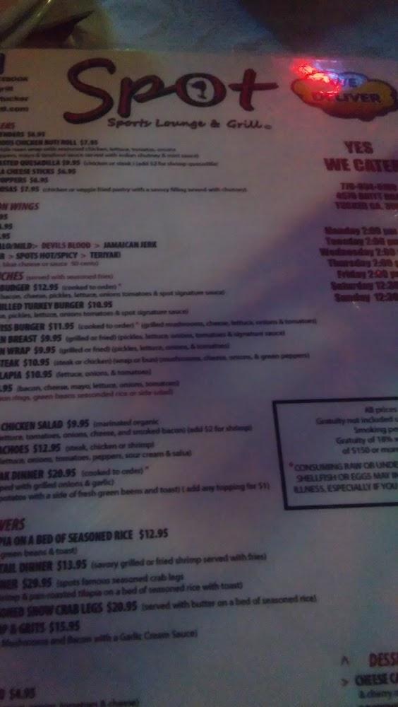 Welcome to The Spot Bar & Grill, your freshly renovated neighborhood hotspot located in Tucker, GA. Enjoy a lively atmosphere featuring delicious American cuisine, specializing in mouth-watering chicken wings, all within a vibrant sports bar setting. Join us for karaoke nights and dance to your favorite tunes, or catch the latest games on our big screens. We offer a range of amenities, including patio seating, takeout, and delivery options, ensuring you have a delightful experience. Our accessible facilities and friendly staff make The Spot the ideal place for gatherings, whether it's a casual dinner or a night out with friends.